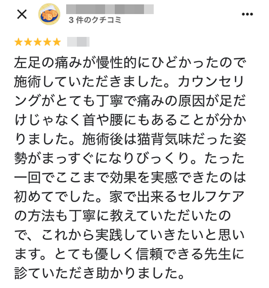 左足の痛みが慢性的にひどかったので施術していただきました。カウンセリングがとても丁寧で痛みの原因が足だけじゃなく首や腰にもあることが分かりました。施術後は猫背気味だった姿勢がまっすぐになりびっくり。たった一回でここまで効果を実感できたのは初めてでした。家で出来るセルフケアの方法も丁寧に教えていただいたので、これからも実践していきたいと思います。とても優しく信頼できる先生に診ていただき助かりました。