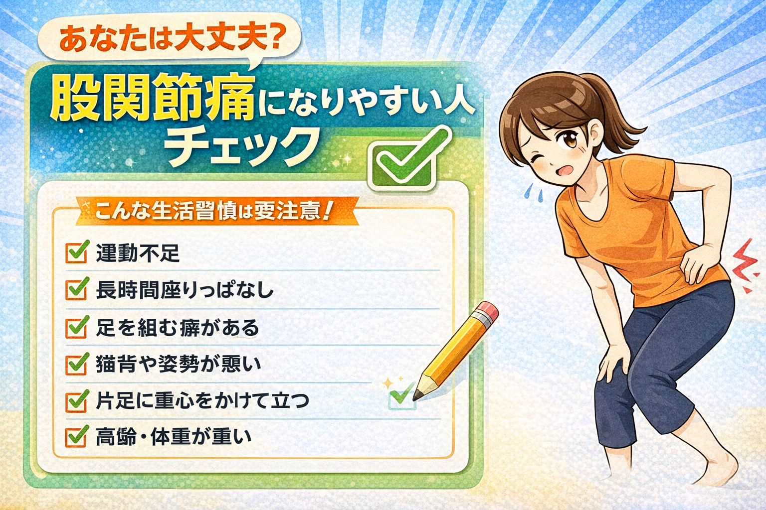 また、足を組むクセや片足に体重をかける立ち方も、股関節に偏った負担をかける原因になることがあります。