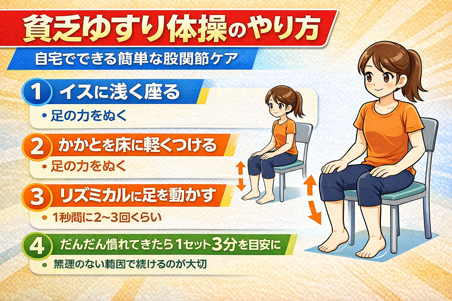 股関節ストレッチや貧乏ゆすり体操は、自宅で簡単に取り入れられるセルフケアとして多くの方が実践しています。
