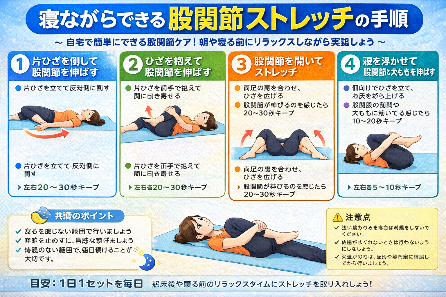 股関節ストレッチや貧乏ゆすり体操は、自宅でできるセルフケアとして取り入れやすい方法です。