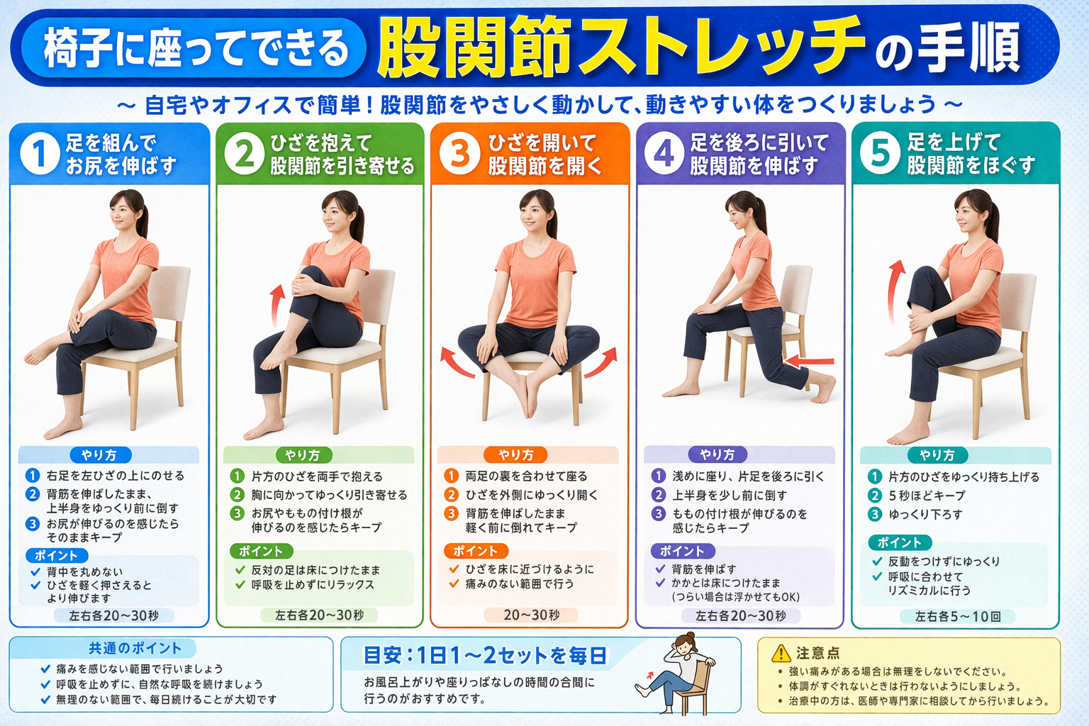 股関節の違和感や痛みがあるときは、無理に強いストレッチをするよりも、股関節をやさしく動かす体操から始めることが大切です。