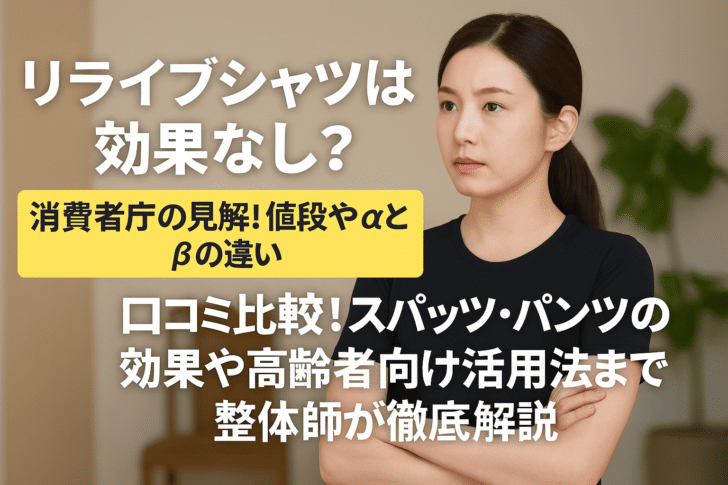 本記事では、整体師の立場から、リライブシャツの基本(仕組み・原理)と効果の捉え方、良い口コミと悪い口コミの要点、消費者庁関連の話題と安全上の注意、値段の相場と購入方法(公式・EC・店舗)、α/βの違いと選び方、スパッツ・パンツなど周辺アイテムの特徴、高齢者向け活用法、サイズ感の目安までを丁寧に整理します。医療機器ではないため疾患の治療を“約束”するものではなく、感じ方には個人差があることも率直にお伝えします。そのうえで、体の使い方や姿勢、生活習慣を見直しながら取り入れることで、はじめて「自分に合う/合わない」の判断軸がクリアになります。
